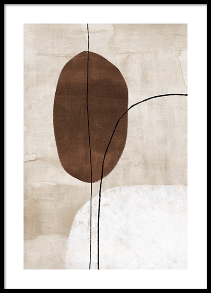 Handpicked Abstrakti maalaus ruskeista, mustista ja valkoisista muodoista ja kynän jäljistä beigellä taustalla. Tämä juliste yhdessä yhteensopivan Art Shapes No2:n kanssa on upea katseenkerääjä moderniin kotiin!