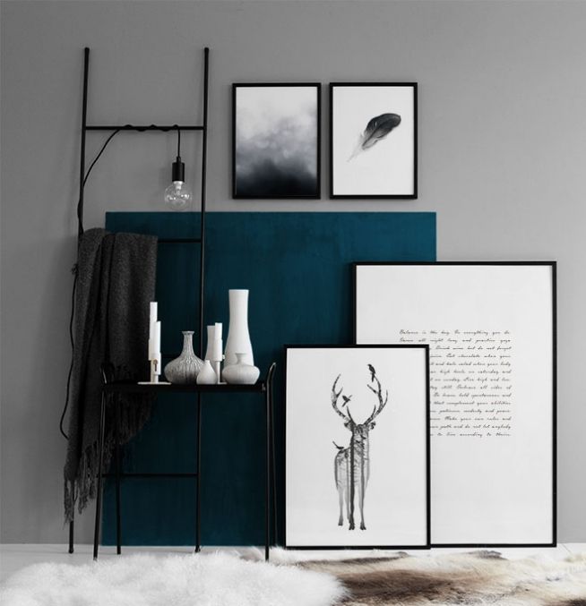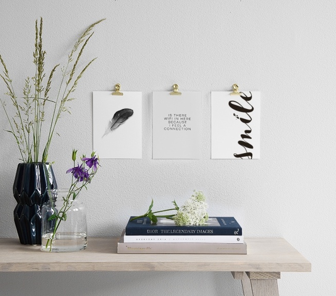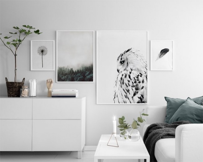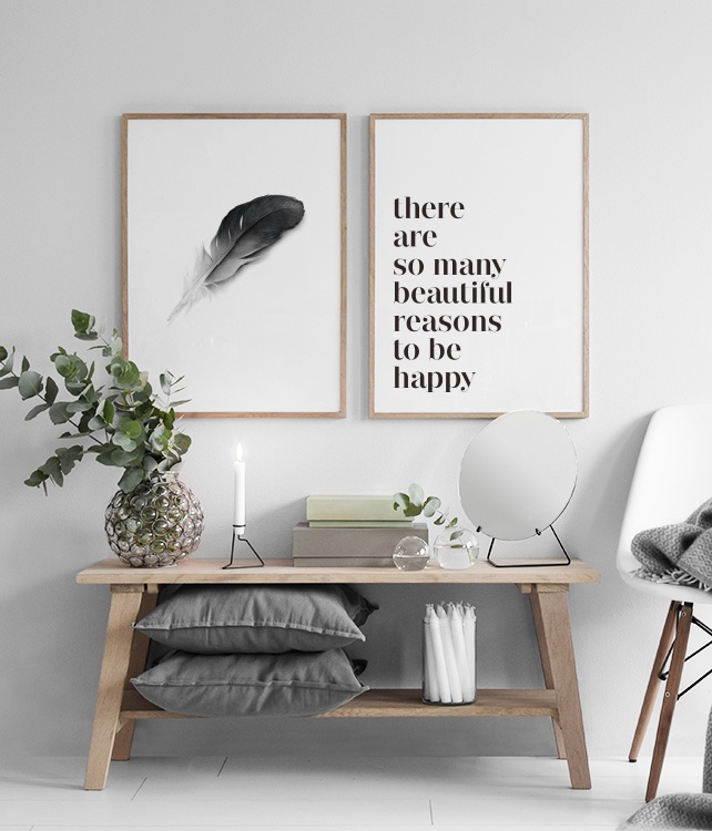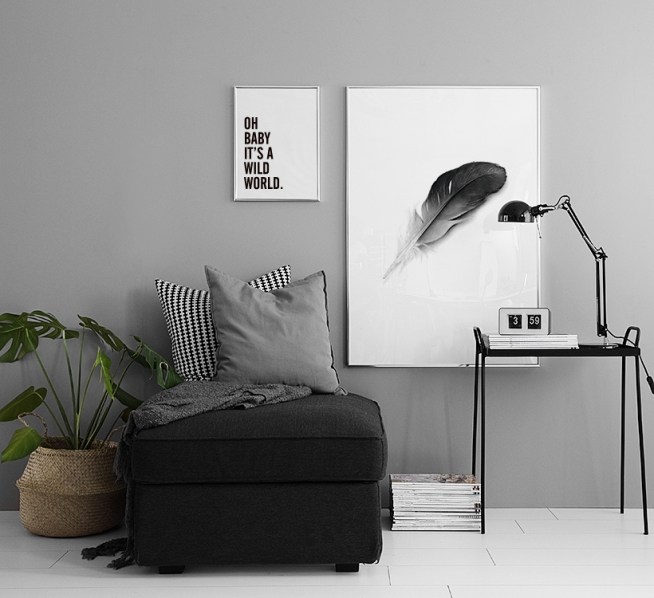 Julisteet ja posterit mustalla sulalla, tyylikästä mustavalkoisessa sisustuksess