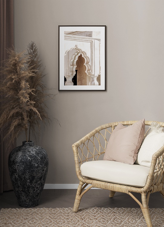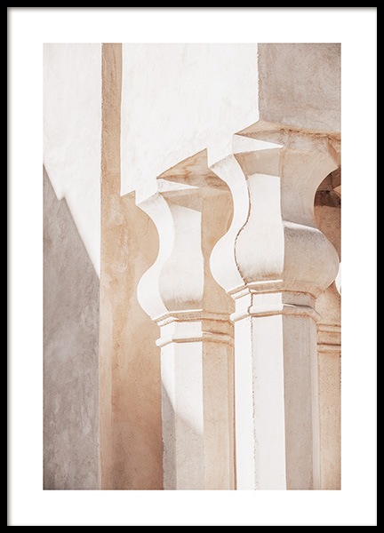Handpicked Valokuva beigenvärisestä rakennusta holvikaarineen. Marrakech on tunnettu kauniista vanhoista ja värikkäistä kultakoristeisista rakennuksistaan, ja tämä kokoelma ilmentää varmasti kaiken kaupungin tarjoaman kauneuden. Tämä juliste on osa Marrakechissa toimivan Desenio Design Studion kuvaamaa Studio Amara -valokuvakokoelmaa.