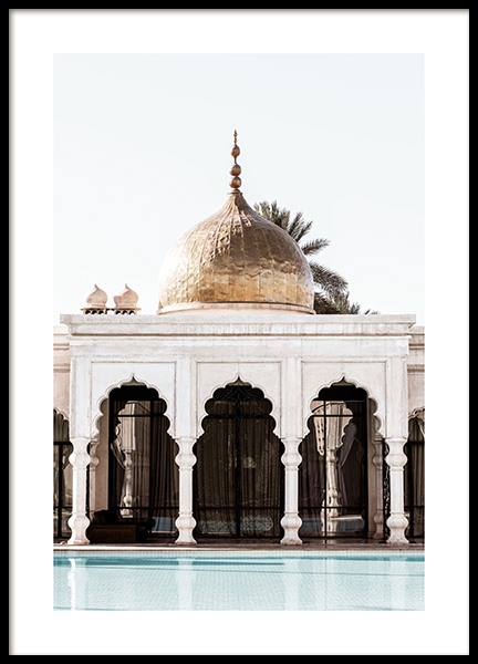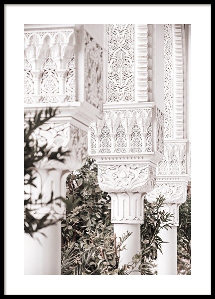 Handpicked Valokuva valkoisesta, soikeasta holvikaaresta käsityönä tehtyine koristeineen ja mustasta ovesta. Marrakechin rakennustaiteen lumoavat yksityiskohdat ja historia ihastuttavat ja hämmästyttävät. Tämä juliste on osa Marrakechissa toimivan Desenio Design Studion kuvaamaa Studio Amara -valokuvakokoelmaa.