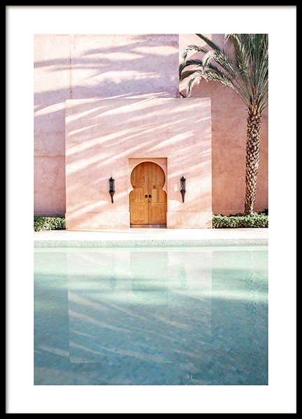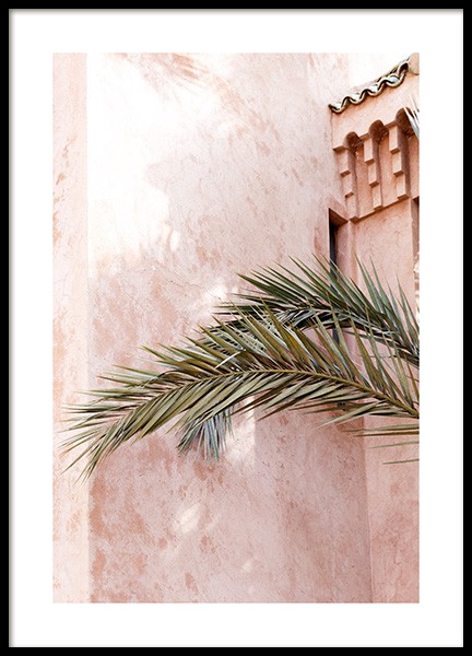 Handpicked Valokuva vaaleanpunaiselle seinälle piirtyneestä varjosta, vasemmalla suuria palmunlehtiä. Kirkkailla ja värikkäillä julisteilla koristeltuna kotisi muuttuu hetkessä upouuden oloiseksi! Tämä juliste on osa Marrakechissa toimivan Desenio Design Studion kuvaamaa Studio Amara -valokuvakokoelmaa.