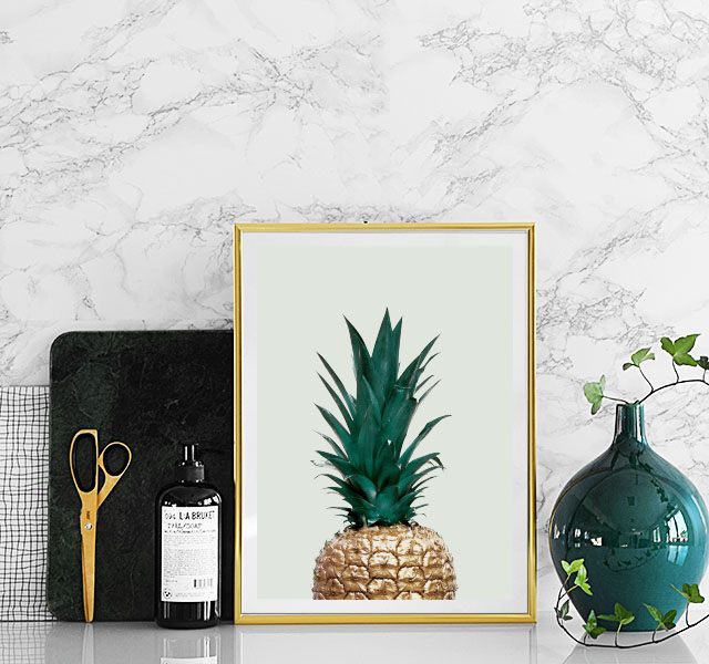 Handpicked Juliste, jossa on kultainen ananas vaaleanvihreää taustaa vasten. Tyylikäs ja trendikäs ja sopii mainiosti moniin sisustustyyleihin. Julisteessa on sisäänrakennettu kehyskartonki, joka tuo kuvan kauniisti esille.