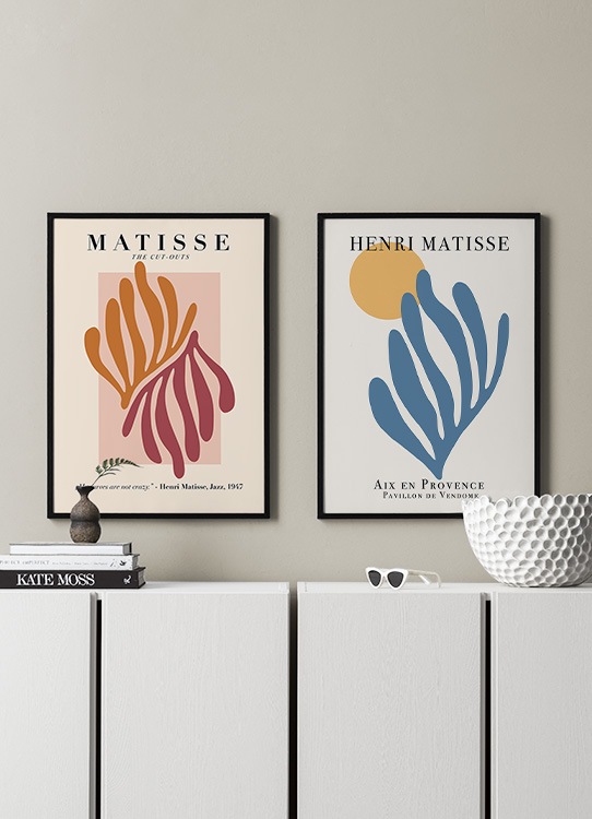Etsitpä sitten yhtä tai kahta julistetta tai kokonaan uutta Matisse-julisteiden ryhmää, tämä on paikka josta löydät ne! Matisse-taiteen sarjamme koostuu klassisista abstrakteista lehdistä sekä kirkkaissa väreissä että yksivärisissä sävyissä, ja jokaiseen makuun löytyy kyllä jotakin. Henri Matisse oli todellinen edelläkävijä modernistien keskuudessa ja hänen työnsä ovat rakastettuja ympäri maailman. Hänen uniikki ominaistyylinsä ei koskaan vanhene.