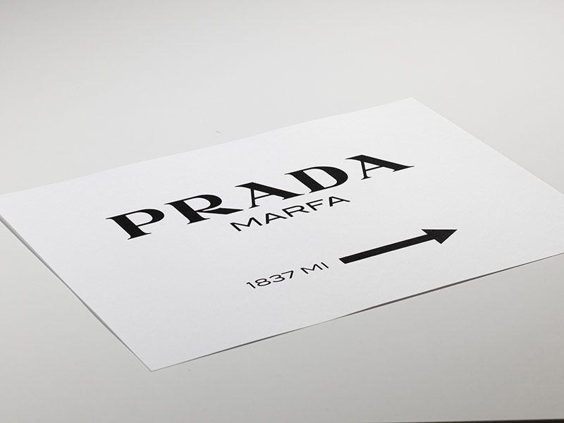– Mustavalkoinen tekstijuliste Prada Marfan logolla