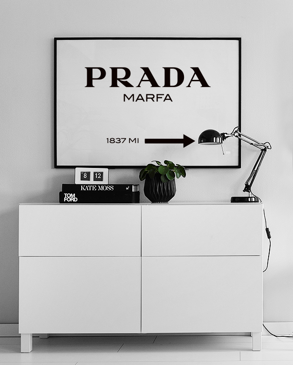 Handpicked Mustavalkoinen tekstijuliste Prada Marfa -logolla. Moderni klassikko! Yksinkertaisena mutta tyylikkäänä tämä Prada Marfa -merkki voidaan ripustaa yhdessä muiden muotijulisteiden trendikkääksi tauluseinäksi. Täydellinen teini-ikäisen huoneeseen, joka antaa persoonallisen kosketuksen huoneeseen.
