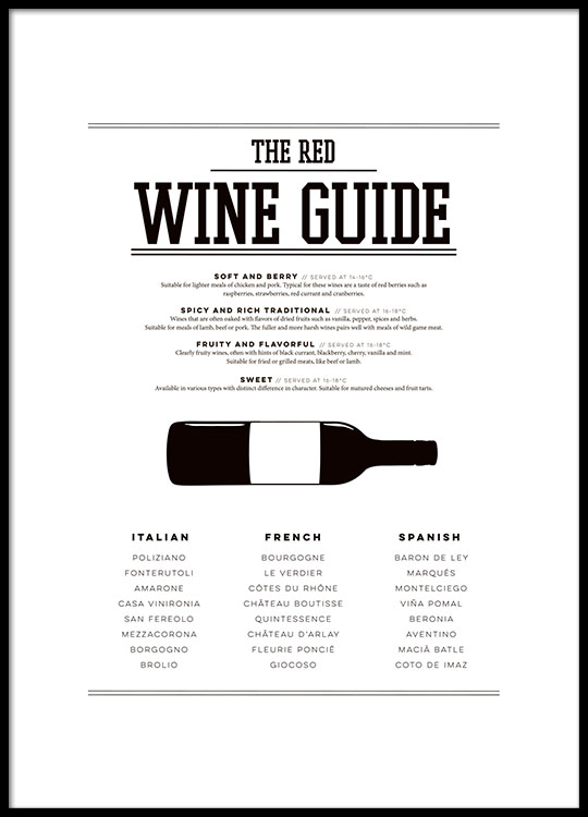 Alkaen 13,97 €Juliste, jossa on viiniopas punaisille viineille. Taulu, joka sopii mainiosti keittiöön, yhdistä siihen muita valikoimamme keittiötauluja, kuten beef ja lamb cuts! Tämä keittiöjuliste sopii hienosti mustiin tai valkoisiin taulunkehyksiin, kun yhdistät siihen muita valikoimamme julisteita ja painokuvia keittiömotiiveilla. Nykyaikainen juliste, joka piristää keittiösi sisustusta. Painettu korkealaatuiselle, päällystämättömälle, paksulle paperille.