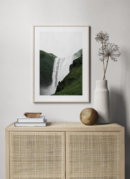 Handpicked Valokuva Skogafoss-vesiputouksesta ja vihreästä maisemasta Islannista. Löydä suosikkijulisteesi Studio Elementsistä - Desenio Design Studion ainutlaatuisesta valokuvakokoelmasta. Syvenny taikaan ja anna luonnon voiman valloittaa.