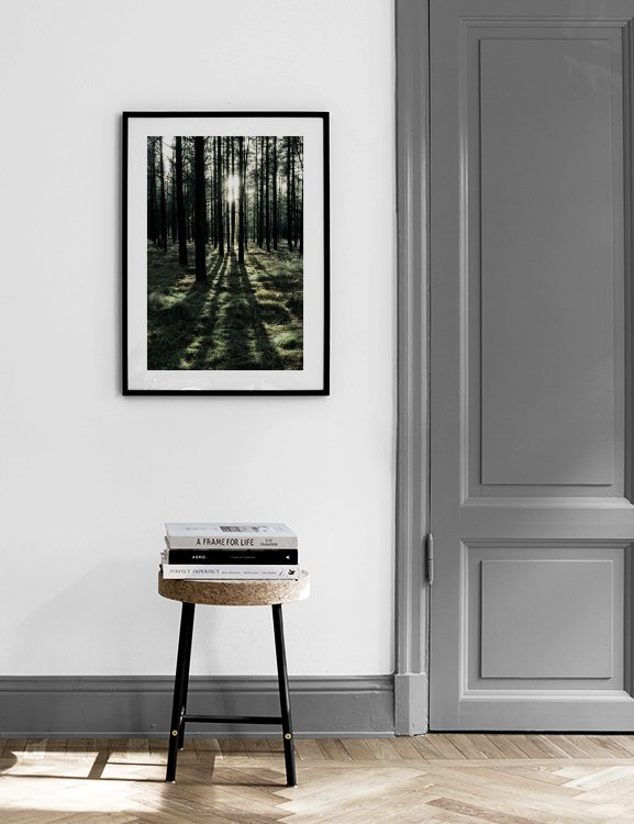 Valokuva metsästä ja puiden lävitse siivilöityvästä auringonvalosta. Tiedostavat luontojulisteet ovat paras tapa luoda rauhoittava, mutta samalla eläväinen koti, ja yhdessä muiden luontojulisteiden kanssa onnistut luomaan täydellisen tauluseinän!