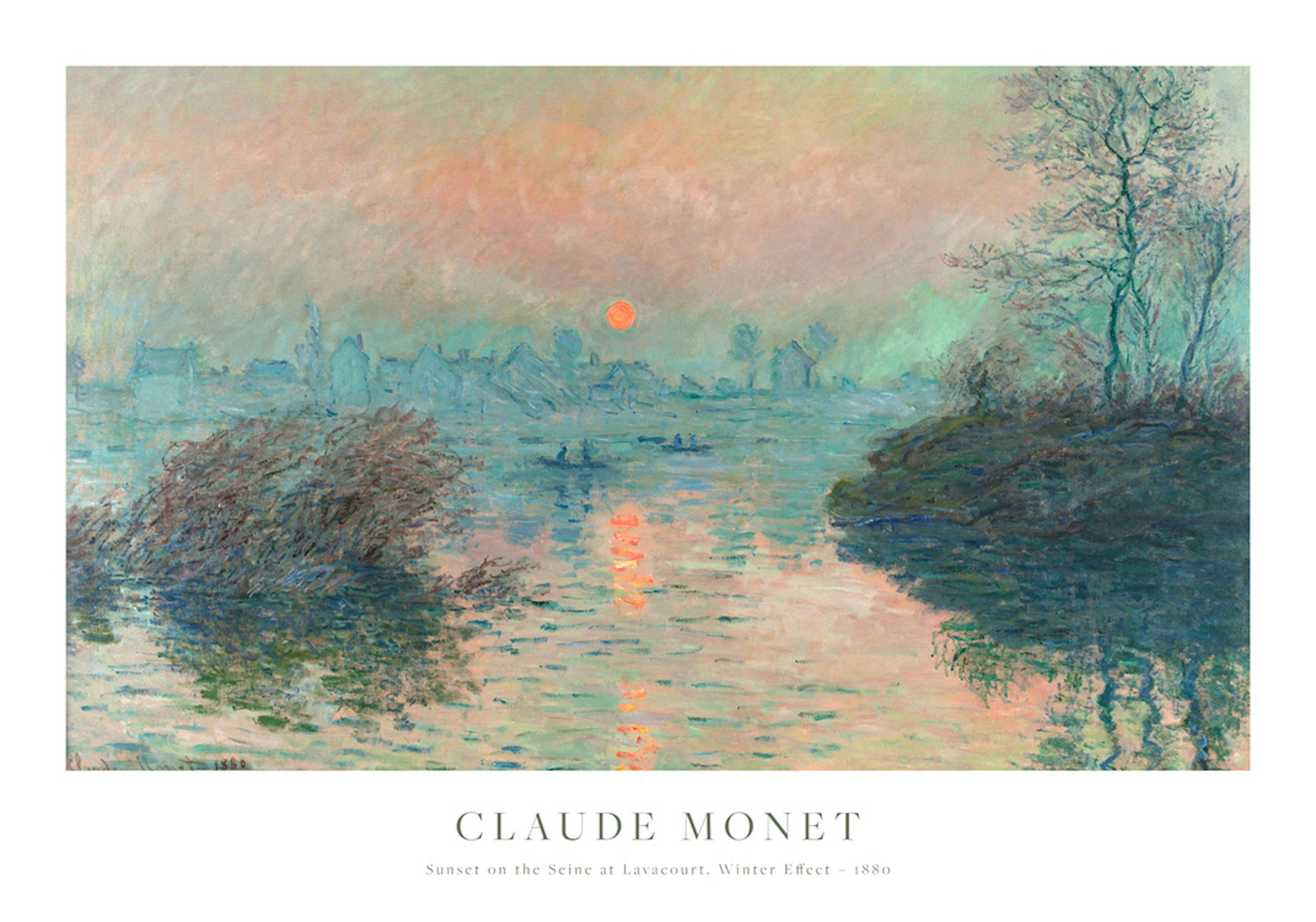 'Klassinen Monet-juliste erilaisissa vihreissä väreissä ja merestä heijastuvasta auringonlaskusta. Näet horisontissa pienen kylän ja julisteen alareunassa tekstin ''Sunset on the Seine at Lavacourt, Winter Effect - 1880''.
