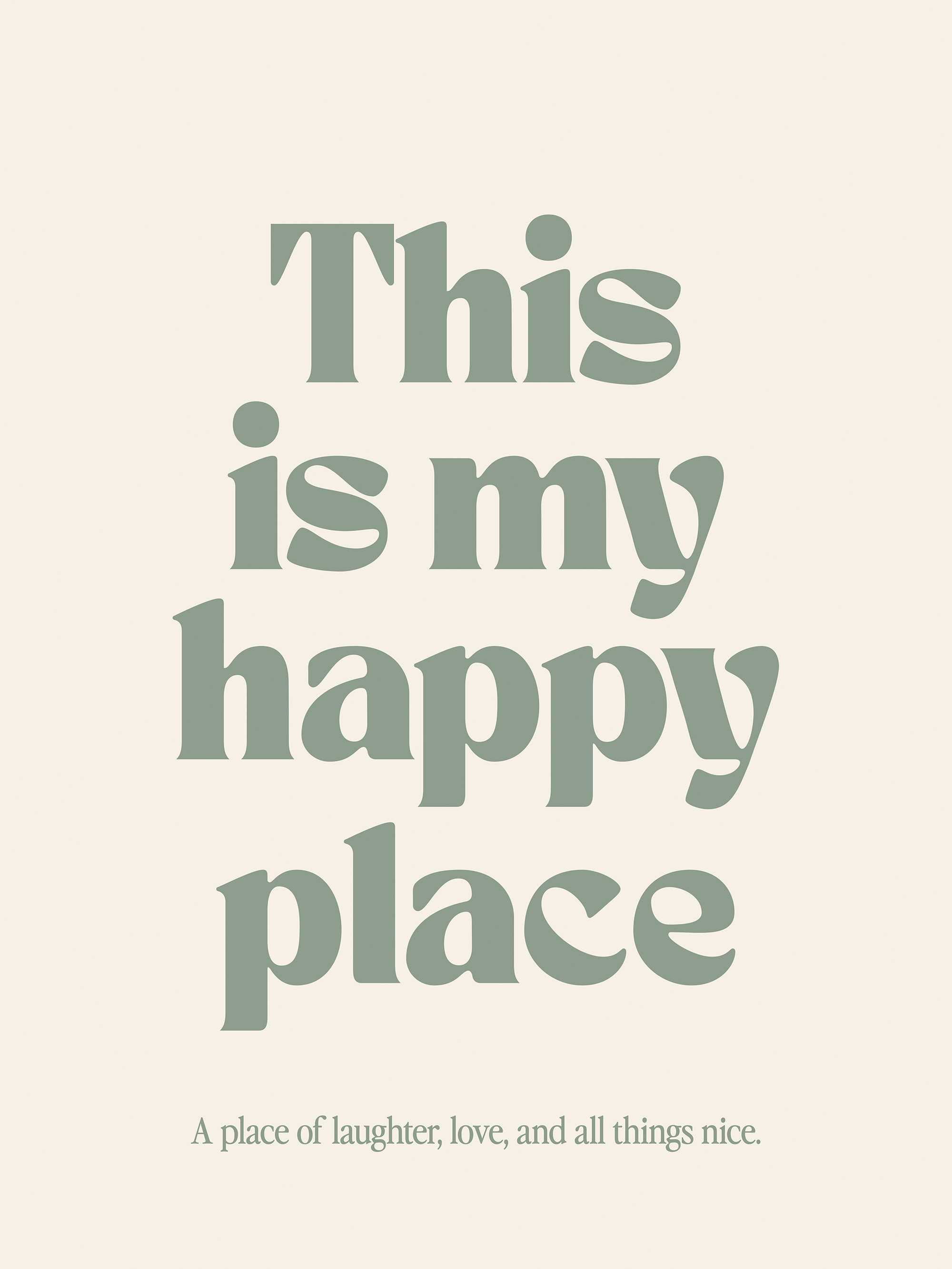 Motivoiva juliste vihreällä tekstillä beigellä taustalla, jossa lukee "This is my happy place".
