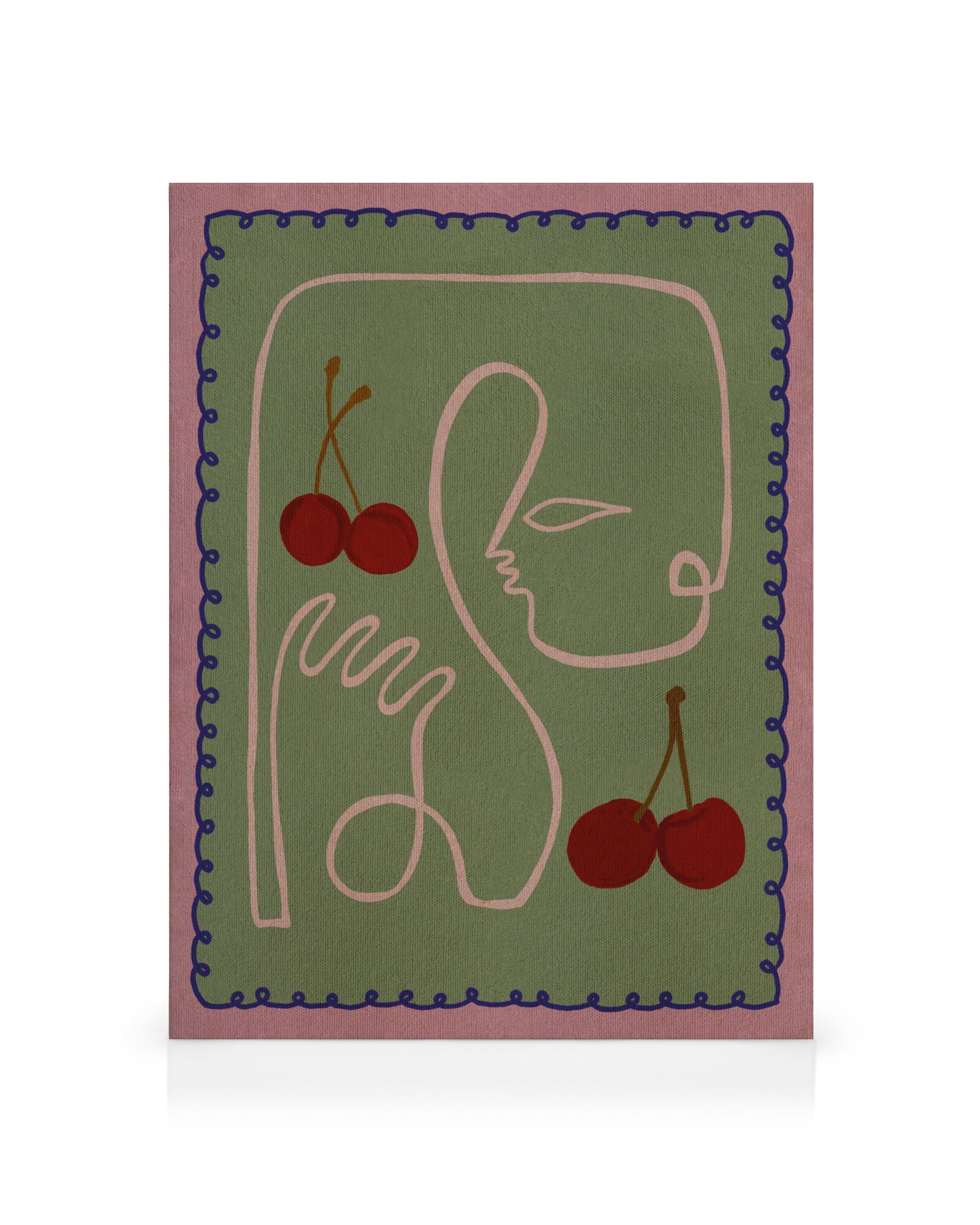 Alkaen 24,95 €Kanvaasi, jossa on yksinkertainen viivataide, joka esittää kasvot ja käden punaisten kirsikkojen kanssa vihreällä taustalla. Minimalistisessa designissa on vaaleanpunaiset viivat ja vaaleanpunainen reunus, jossa on aaltoileva sininen viiva.