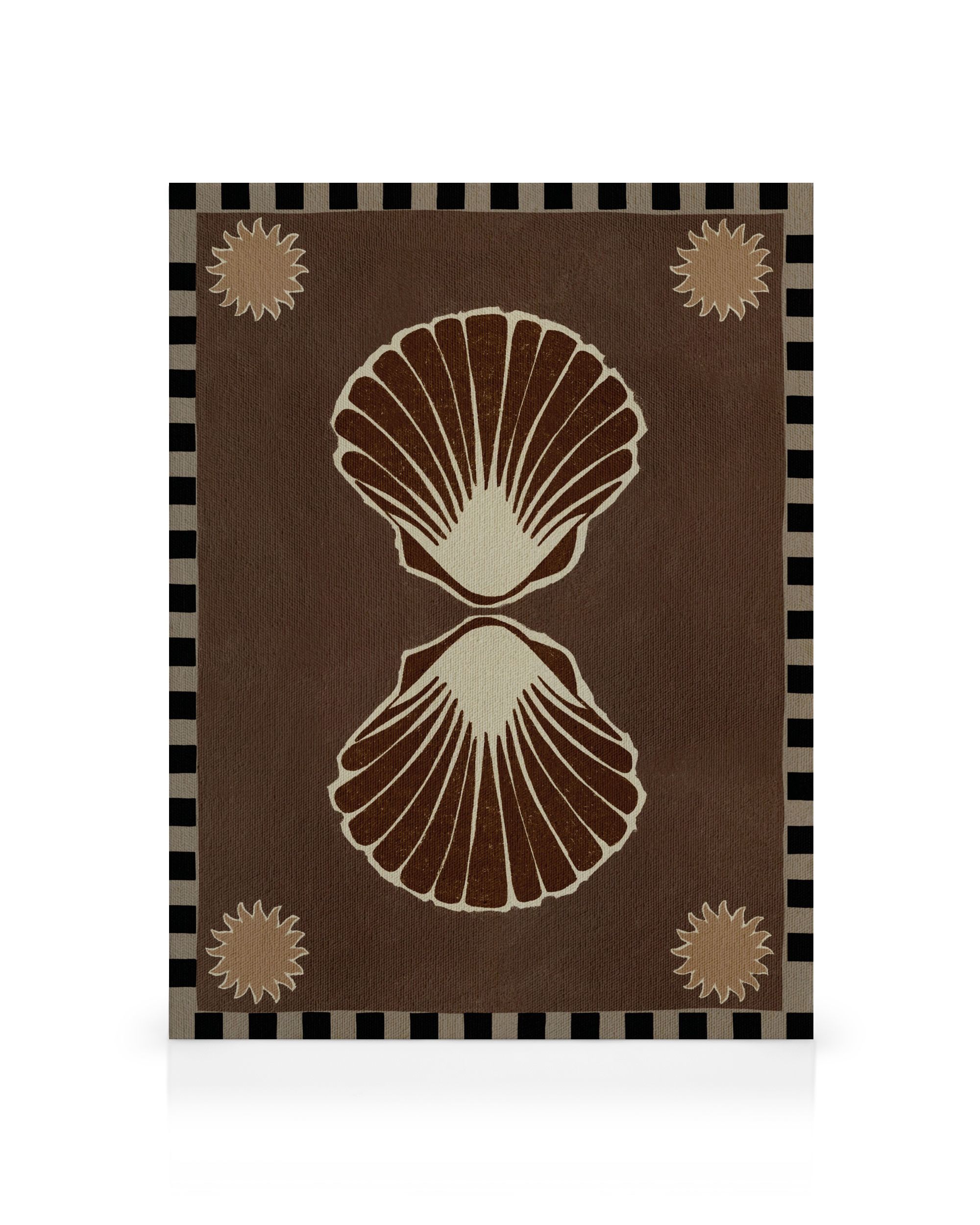 Alkaen 24,95 €Kanvaasi, jossa on kaksi suurta simpukankuoren muotoa ruskeissa ja kermanvärisissä sävyissä tummanruskealla taustalla, tähden muotoisia kuvioita jokaisessa kulmassa ja koristeellinen reunus.