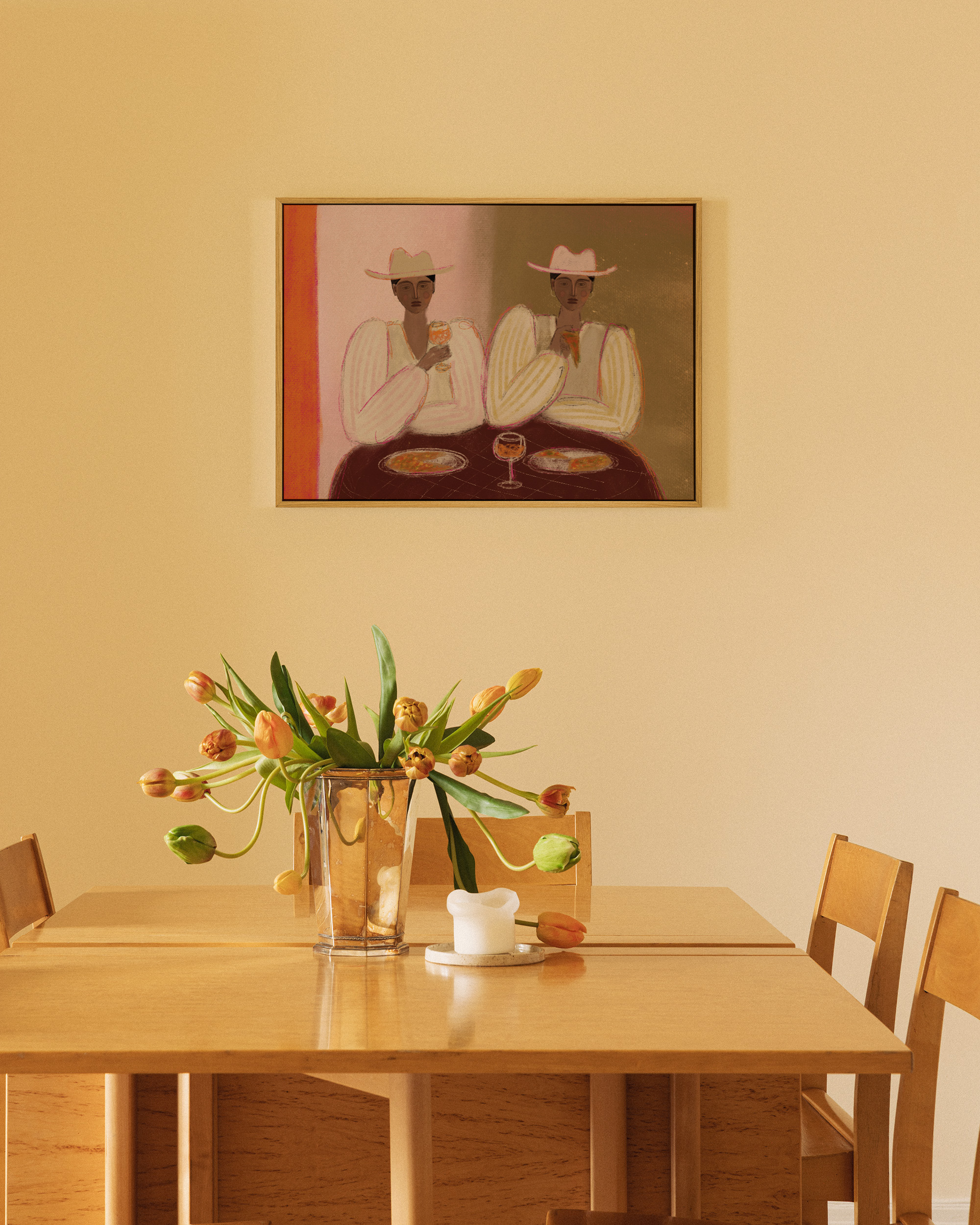 Alkaen 19,96 €Kanvaasi, joka kuvaa kahta ihmistä nauttimassa pizzaa ja juomia pöydän ääressä. Kuvassa on pehmeitä sävyjä vaaleanpunaisena, oranssina ja ruskeana.