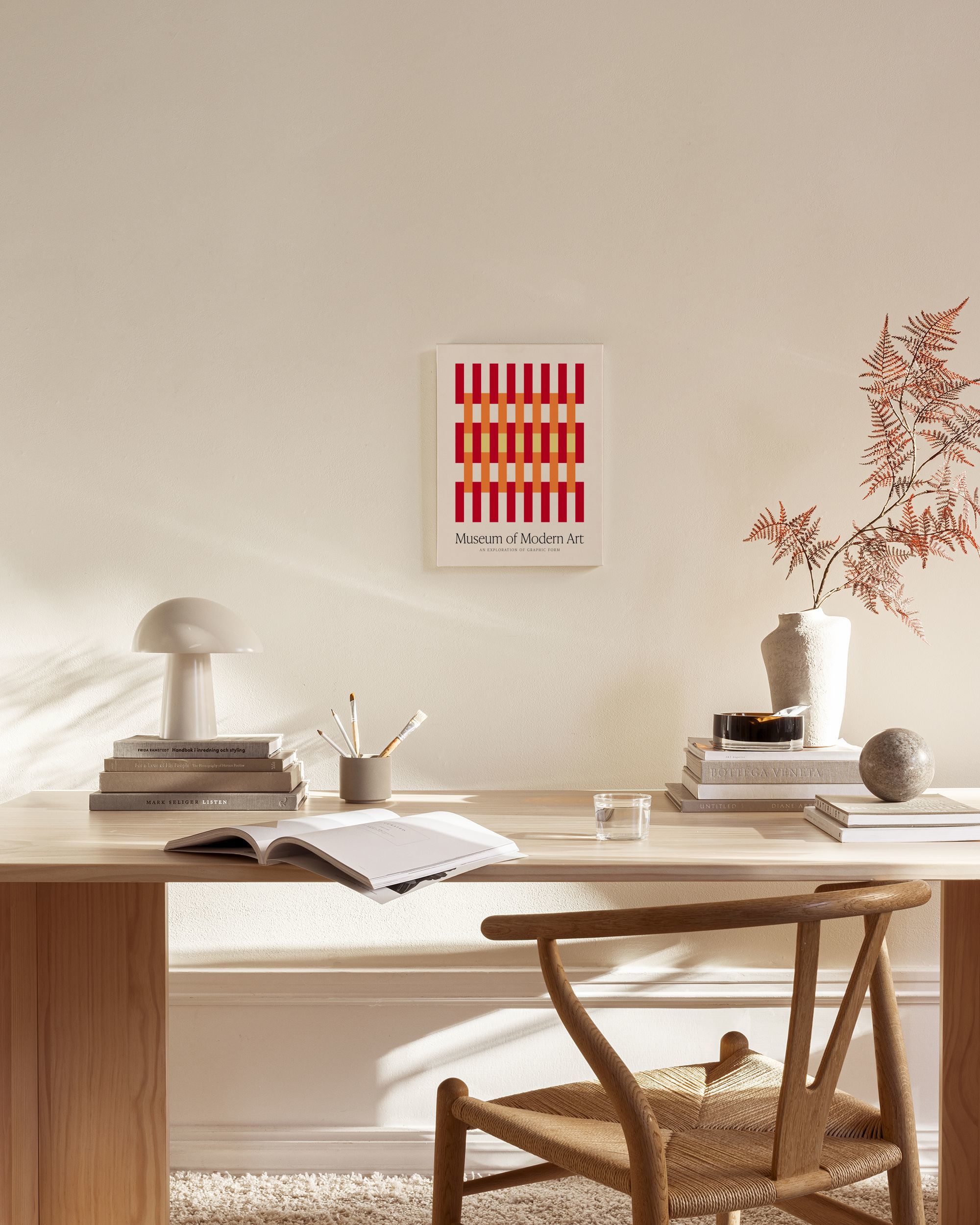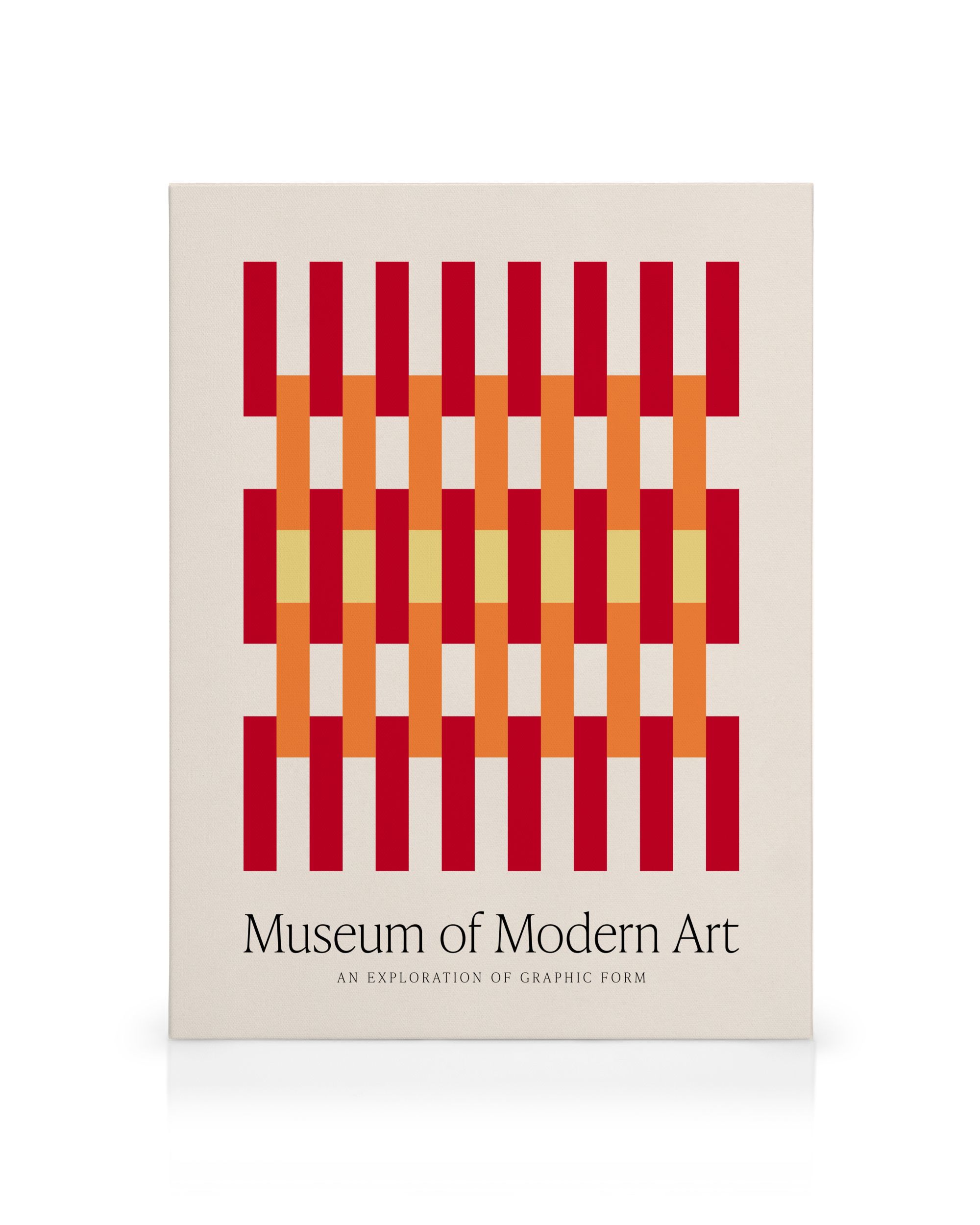 Alkaen 24,95 €Kanvaasi, jossa pystysuorat punaiset ja oranssit palkit risteävät keltaisten vaakasuorien palkkien kanssa beigellä taustalla, luoden kudotun efektin yksinkertaisilla geometrisilla muodoilla.
